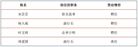 该行2025年半年报披露,报告期内,副行长周爱国离任,聘任杨大威为副行长。