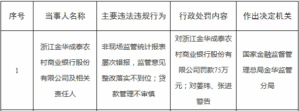 7月30日,国家金融监督管理总局金华监管分局发布的行政处罚信息显示,浙江金华成泰农商银行因“非现场监管统计报表屡次错报,监管意见整改落实不到位;贷款管理不审慎”等2项主要违法违规行为,被罚款75万元。