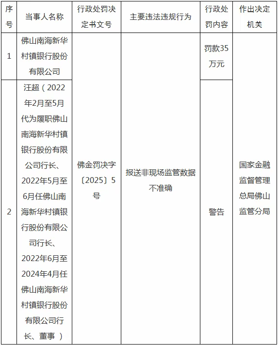 6月13日,国家金融监督管理总局佛山监管分局发布的行政处罚信息显示,佛山南海新华村镇银行因“报送非现场监管数据不准确”,被罚款35万元。同时,对相关责任人汪超进行警告。