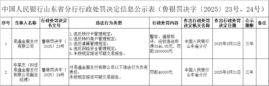 9月8日,中国人民银行山东省分行发布新罚单。易通金服支付有限公司(下称“易通金服”)因以下5项违法行为被警告、通报批评,没收违法所得3346.05元,罚款180万元。同时,时任易通金服副总经理毕某杰被罚款4万元。