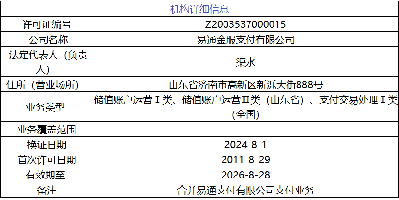 据移动支付网了解,易通金服于2011年3月29日成立,注册资本4亿元,为山东易通发展集团有限公司全资子公司,属鲁商集团二级子公司,在2011年获得《支付业务许可证》。易通金服的前身为通卡公司,2016年4月山东鲁商一卡通支付有限公司在续展时合并了易通支付有限公司的支付业务,并于2017年5月正式更名为易通金服。合并后,易通金服业务类型为预付卡发行与受理(山东省)、互联网支付、银行卡收单(全国)。支付业务类型重新划分后,易通金服业务类型已变更为“储值账户运营Ⅰ类、储值账户运营Ⅱ类(山东省)、支付交易处理Ⅰ类(全国)”。