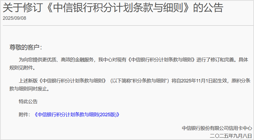9月8日消息,中信银行信用卡中心发布关于修订《中信银行积分计划条款与细则》的公告。公告称,为向用户提供更优质、高效的金融服务,中信银行信用卡中心对现有《中信银行积分计划条款与细则》进行了修订和完善。新版《中信银行积分计划条款与细则》(以下简称“积分条款与细则”)将自2025年11月1日起生效,原积分条款与细则同时废止。