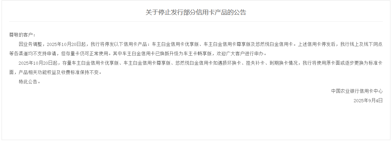 9月4日,中国农业银行信用卡中心发布关于停止发行部分信用卡产品的公告。公告称,因业务调整,2025年10月20日起,将停发车主白金信用卡优享版、车主白金信用卡尊享版及悠然悦白金信用卡。上述信用卡停发后,中国农业银行线上及线下网点等各渠道均不支持申请,但存量卡仍可正常使用。其中车主白金信用卡已焕新升级为车主卡畅享版。