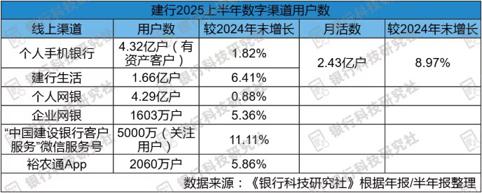 其个人网银用户数达4.29亿户,较上年末增长0.88%;企业网银用户数1603万户,较上年末增长5.36%。“中国建设银行客户服务”微信服务号关注用户突破5000万人。“裕农通”App注册用户超2060万户,上半年新增近120万户。