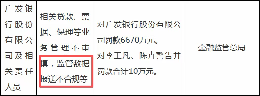 广发银行因“相关贷款、票据、保理等业务管理不审慎,监管数据报送不合规等”,被罚款6670万元。同时,对李工凡、陈卉警告并罚款合计10万元。