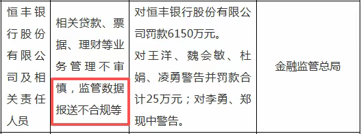 恒丰银行因“相关贷款、票据、理财等业务管理不审慎,监管数据报送不合规等”,被罚款6150万元。同时,对王洋、魏会敏、杜娟、凌勇警告并罚款合计25万元;对李勇、郑现中警告。