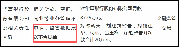 而在前几天的9月5日,同样来自国家金融监督管理总局的行政处罚信息显示,华夏银行因“相关贷款、票据、同业等业务管理不审慎,监管数据报送不合规等”,被罚款8725万元。同时,对陈成天、刘建新警告;对钱建华、何羽、吕玉梅、涂超警告并罚款合计20万元。