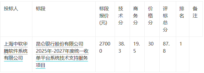 昆仑银行2025年-2027年度统一收单平台系统技术支持服务项目评标结果公示