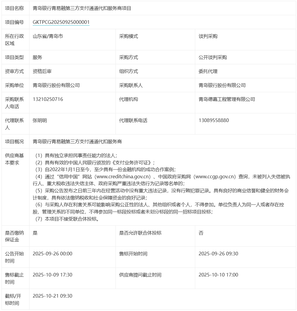 青岛银行青易融第三方支付通道代扣服务商项目公开谈判采购公告