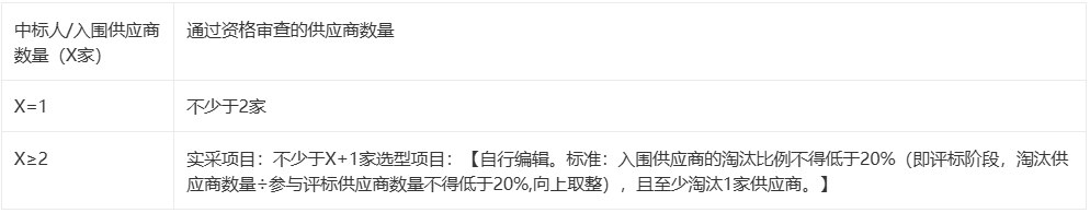 通过资格审查的供应商数量符合下表条件时,才能进入后续详细评审,否则本项目废标。