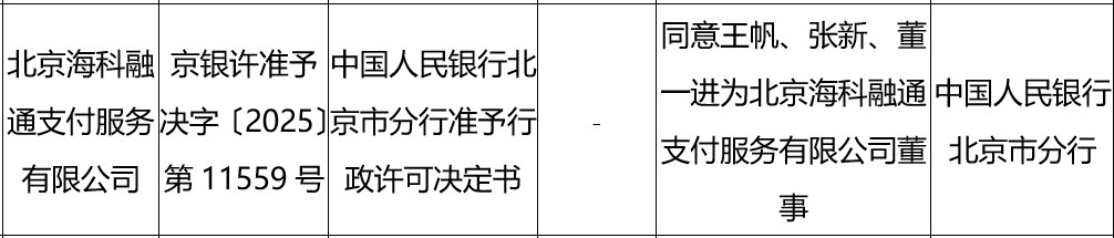 10月14日,中国人民银行北京市分行非银行支付机构重大事项变更许可信息公示显示,同意王帆、张新、董一进为北京海科融通支付服务有限公司(下称“海科融通”)董事。