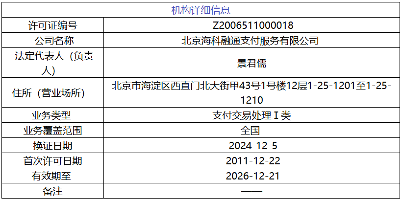 公开资料显示,海科融通成立于2001年,于2011年获得《支付业务许可证》,中国人民银行准许其在全国范围内开展银行卡收单业务。2024年《非银行支付机构监督管理条例》实施后,业务类型更新为“支付交易处理Ⅰ类”。