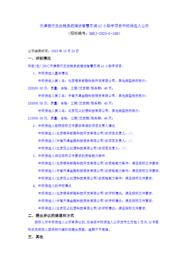 天津银行反洗钱系统增设智慧尽调AI小助手项目中标候选人公示