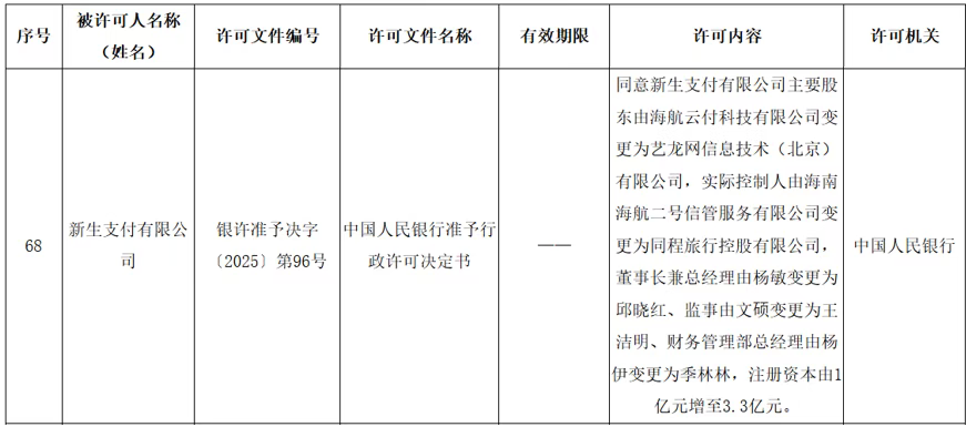 人民银行官网日前公示的支付机构重大事项变更许可信息(截至2025年10月)显示,同意新生支付有限公司(简称“新生支付”)主要股东由海航云付科技有限公司变更为艺龙网信息技术(北京)有限公司(简称“艺龙网”),实际控制人由海南海航二号信管服务有限公司变更为同程旅行控股有限公司,董事长兼总经理由杨敏变更为邱晓红、监事由文硕变更为王洁明、财务管理部总经理由杨伊变更为季林林,注册资本由1亿元增至3.3亿元。