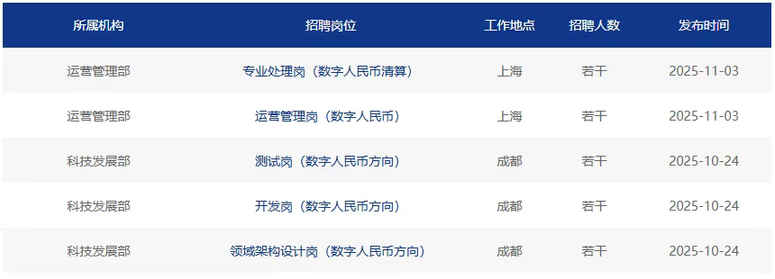 近日,浦发银行在官网社会招聘中发布了一系列招聘信息,其中运营管理部、科技发展部共招聘五个数字人民币方向相关的岗位。
