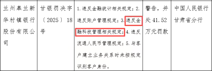 10月22日,中国人民银行甘肃省分行发布的行政处罚信息显示,兰州皋兰新华村镇银行因“违反金融科技管理相关规定”等5项违法行为,被警告,并被罚款41.52万元。企查查信息显示,兰州皋兰新华村镇银行的最大股东为安徽马鞍山农商银行,后者持股比例为45.65%。