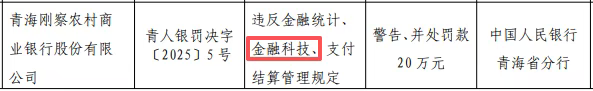 10月20日,中国人民银行青海省分行发布的行政处罚信息显示,青海刚察农商银行因“违反金融统计、金融科技、支付结算管理规定”,被警告,并被罚款20万元。