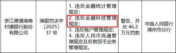 10月15日,中国人民银行湖州市分行发布的行政处信息显示,浙江德清湖商村镇银行因“违反金融科技管理规定”等4项违法行为,被警告,并被罚款46.2万元。企查查信息显示,浙江德清湖商村镇银行的最大股东为浙江南浔农商银行,后者持股比例为41.00%。