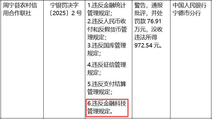 周宁县农村信用合作联社因“违反金融科技管理规定”等6项违法行为,被警告、通报批评,被罚款76.91万元,并被没收违法所得972.54元。