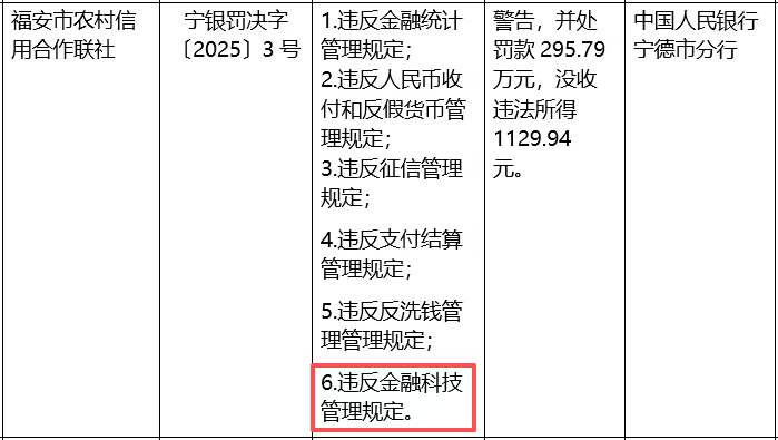 福安市农村信用合作联社因“违反金融科技管理规定”等6项违法行为,被警告,被罚款295.79万元,并被没收违法所得1129.94元。同时,6人被罚,其中,时任该农信联社信息科技部总经理王某对“未按规定履行客户身份识别义务;与身份不明的客户进行交易”负有责任,被罚款3.2万元。