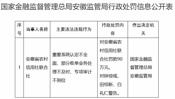 11月21日,国家金融监督管理总局安徽监管分局发布新罚单。罚单显示,安徽省农村信用社联合社因“重要系统认定不全面、部分收单业务处理不及时、专项审计不到位”被罚款90万元。此外,还对钟琼瑶、田绍新、白礼仁三位相关责任人给予警告处分。