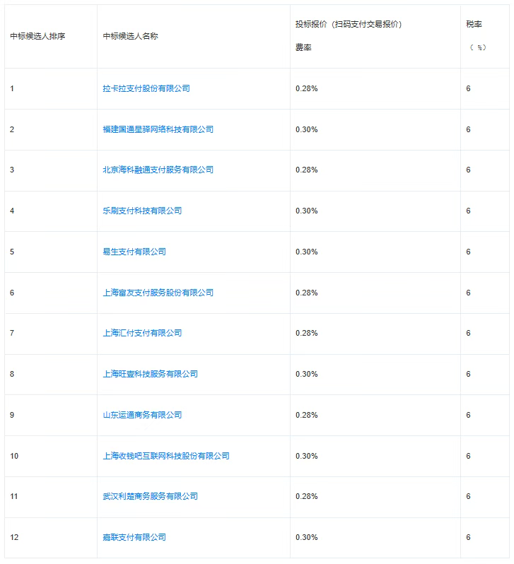 根据公示,本次共有12家支付机构进入候选名单,覆盖行业主要收单服务商,包括拉卡拉、国通星驿、海科融通、乐刷、易生支付、富友支付、汇付支付、旺壹科技、运通商务、收钱吧、利楚商务及嘉联支付等。