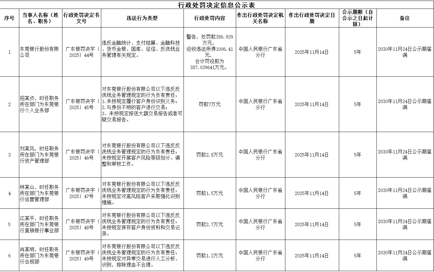 11月26日,据中国人民银行广东省分行行政处罚决定信息公示表显示,东莞银行股份有限公司因违反金融统计、支付结算、金融科技、货币金银、国库、征信、反洗钱业务管理有关规定,被警告并处罚款386.939万元,被没收违法所得1006.41元,合计罚没款为387.039641万元。