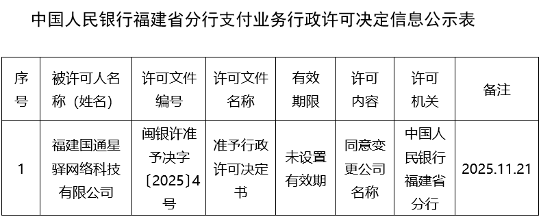 中国人民银行福建省分行支付业务行政许可决定信息公示表(2025年11月21日)显示,同意福建国通星驿网络科技有限公司(下称“国通星驿”)变更公司名称,但新公司名并未披露。