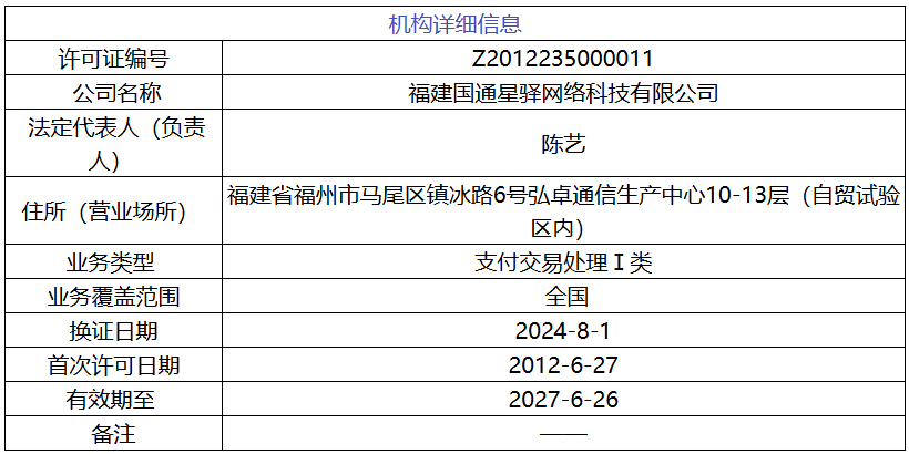 公开资料显示,国通星驿成立于2010年6月,注册资本为30000万元,是上市公司新大陆的控股子公司。2012年获得支付牌照,人行准许其在全国范围内开展银行卡收单业务,2024年支付业务类型调整后,国通星驿业务类型调整为“支付交易处理Ⅰ类”。