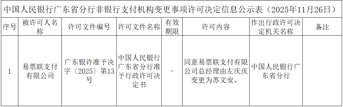中国人民银行广东省分行非银行支付机构变更事项许可决定信息公示表(2025年11月26日)显示,同意易票联支付有限公司(下称“易票联支付”)总经理由左庆庆变更为苏文安。