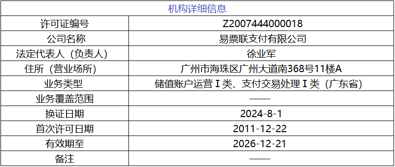 据移动支付网了解,易票联支付成立于1999年,总部在广州,为国内较早开展支付业务的公司之一,于2011年获得人民银行颁发的《支付业务许可证》,资质为互联网支付和银行卡收单(广东省)。易票联在2021年12月通过第二次续展,牌照有效期延至2026年12月。2024年支付业务类型调整后,易票联支付业务类型调整为“储值账户运营Ⅰ类、支付交易处理Ⅰ类(广东省)”。