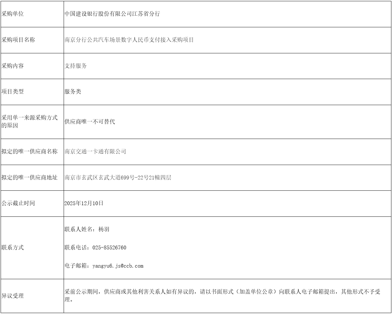 建行江苏省分行关于南京分行公共汽车场景数字人民币支付接入采购项目单一来源采前公示