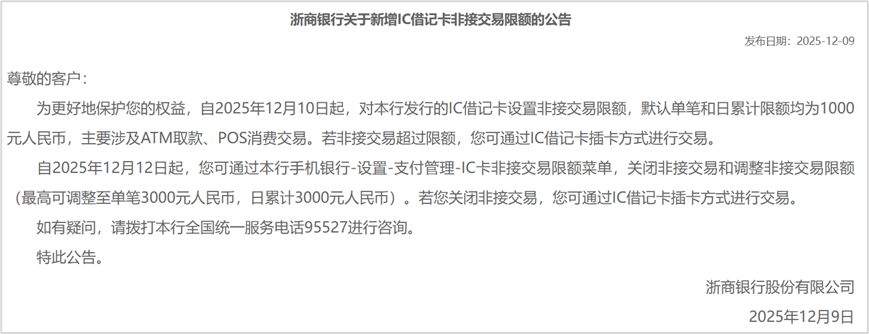 12月9日,浙商银行发布关于新增IC借记卡非接交易限额的公告。公告称,为更好地保护用户的权益,自2025年12月10日起,对本行发行的IC借记卡设置非接交易限额,默认单笔和日累计限额均为1000元人民币,主要涉及ATM取款、POS消费交易。若非接交易超过限额,用户可通过IC借记卡插卡方式进行交易。
