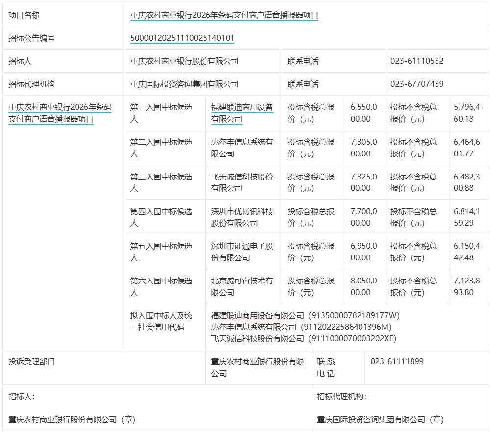 重庆农商银行2026年条码支付商户语音播报器项目的中标候选人公示