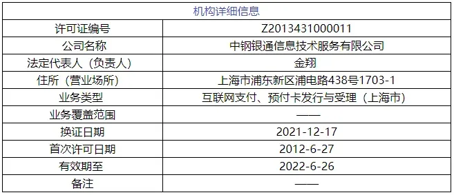 移动支付网12月26日消息,中国人民银行官网更新了支付业务许可信息公示的已注销许可机构名单,中钢银通信息技术服务有限公司(下称“中钢银通”)上榜,备注是“不予续展(换证)”。