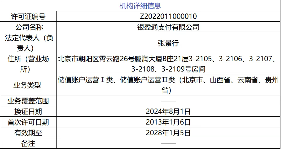 据移动支付网了解,银盈通于2005年4月在北京注册成立,2013年1月获得《支付业务许可证》,获准开展互联网支付业务以及在北京市、山西省、云南省、贵州省等地开展预付卡发行与受理业务。2023年1月,银盈通《支付业务许可证》顺利通过续展,牌照有效期延至2028年1月。随着支付业务类型重新划分,银盈通业务类型调整为“储值账户运营Ⅰ类、储值账户运营Ⅱ类(北京市、山西省、云南省、贵州省)”。