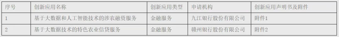 本批次金融科技创新应用申请机构包括九江银行、赣州银行,关注涉农融资、农业信贷等领域。