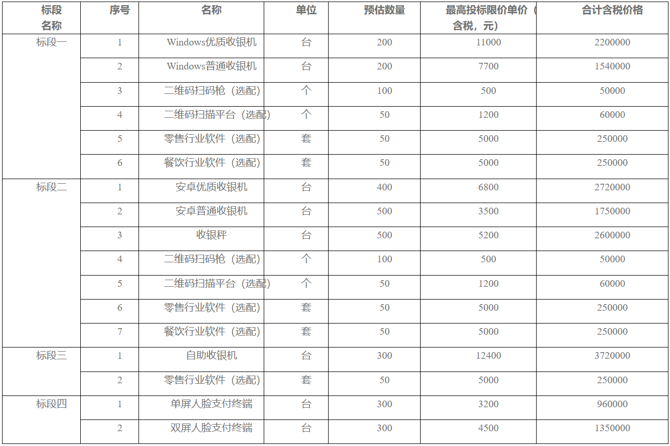 标段一、二主要用途是为商场、商超、餐饮、批发市场等零售商户提供MIS收银机及相关软硬件,业务场景为商户收单业务,包括银行卡收单、聚合支付收单;标段三主要用途是为商场、连锁商超等零售商户提供MIS收银机及相关软硬件,业务场景为商户收单业务,包括银行卡收单、聚合支付收单;标段四主要用途是为智慧食堂业务提供人脸支付收单设备,业务场景为商户收单业务,包括聚合支付收单、人脸支付收单。