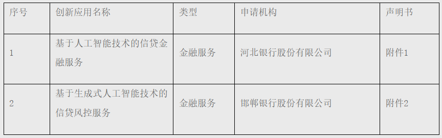 该批次金融科技创新应用共2个,申请机构均为中小银行,包括河北银行、邯郸银行,涉及大模型、机器学习模型、知识检索增强(RAG)、OCR等技术。