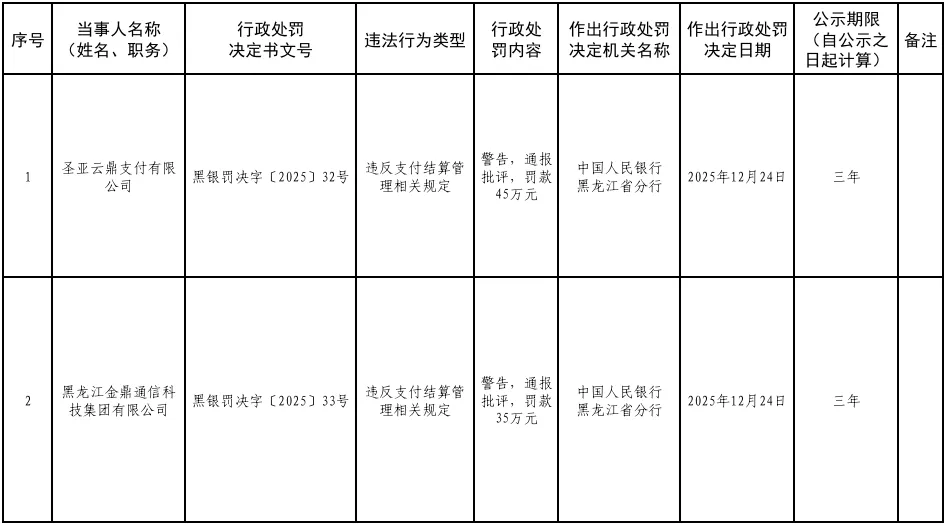 移动支付网消息:近日,根据人民银行黑龙江省分行行政处罚决定信息公示表(黑银罚决字〔2025〕32-33号),支付机构圣亚云鼎支付有限公司(简称“圣亚支付”)因违反支付结算管理相关规定被警告,通报批评并罚款45万元。此外,圣亚支付二股东黑龙江金鼎通信科技集团有限公司(简称“金鼎通信”)也因违反支付结算管理相关规定被警告,通报批评并罚款35万元。