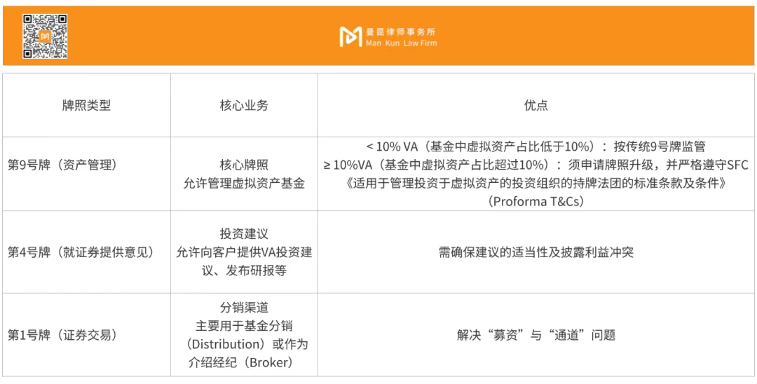 在SFC的监管体系下,涉及虚拟资产活动的牌照主要分为两类:一是以交易所为核心的1+7号牌(VATP,Virtual Asset Trading Platform),门槛极高、申请难度极大;二是以资产管理为核心的1、4、9号牌照。本文重点讨论后者。