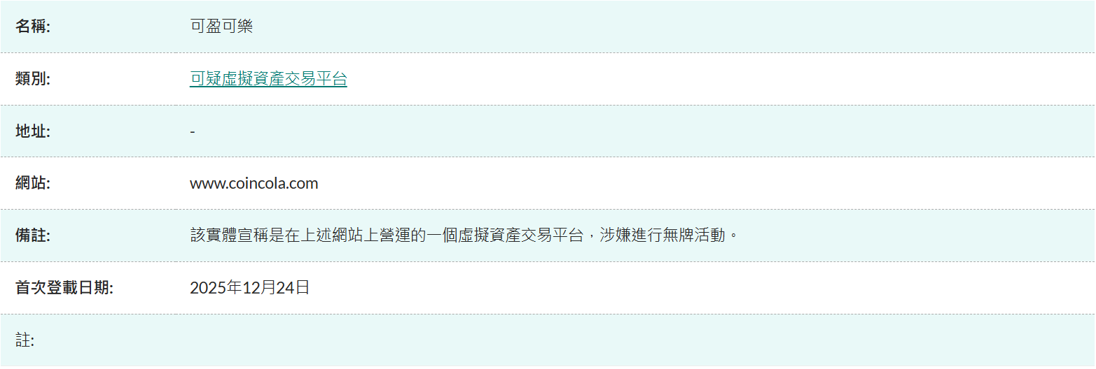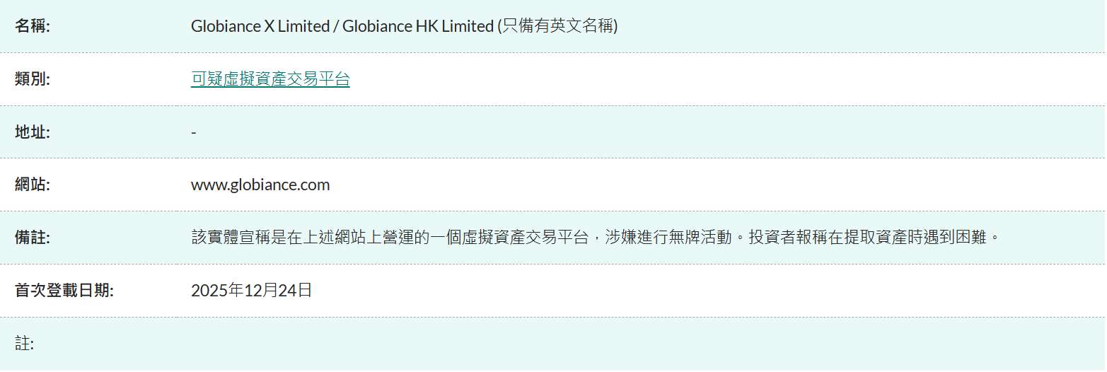 1月6日消息,香港证券及期货事务监察委员会告诫公众,提防无牌虚拟资产交易平台Globiance X Limited/Globiance HK Limited及CoinCola(可盈可乐)。上述机构宣称在香港营运虚拟资产交易平台,但并未持有证监会牌照,涉嫌从事无牌活动;证监会已将其及相关网站列入警示名单。证监会同时表示,已有投资者报称在Globiance相关平台提取资产时遇到困难,并提醒无牌平台不受监管,投资者保障有限,可能面临全部损失风险。