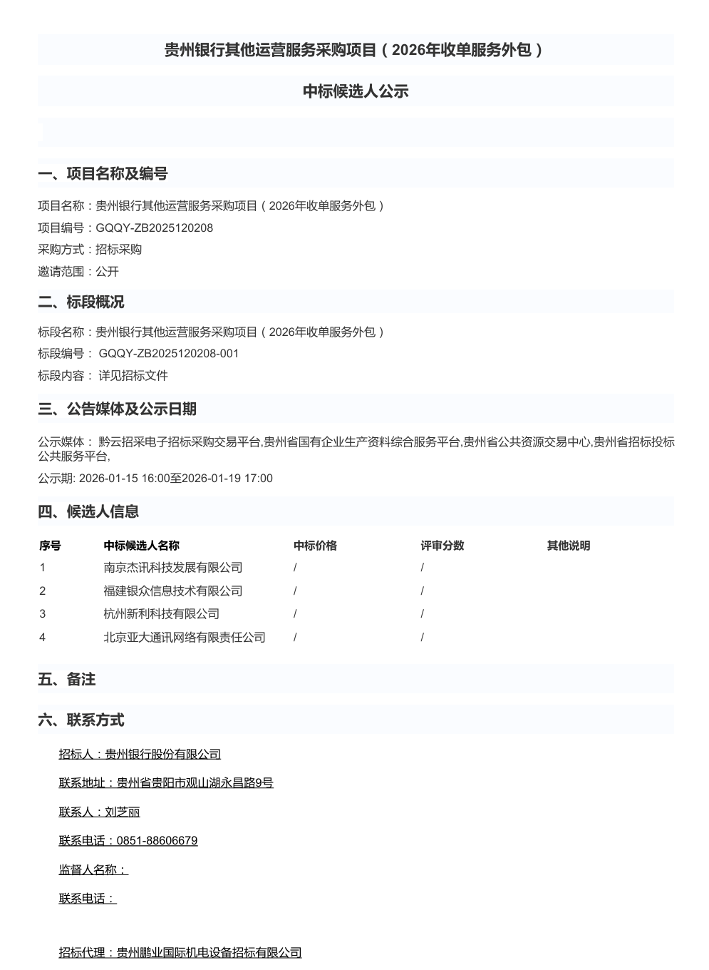 贵州银行其他运营服务采购项目(2026年收单服务外包)中标候选人公示
