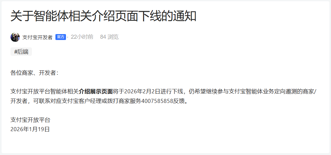 1月19日,支付宝开放平台发布关于智能体相关介绍页面下线的通知。通知称,支付宝开放平台智能体相关介绍展示页面将于2026年2月2日进行下线,仍希望继续参与支付宝智能体业务定向邀测的商家/开发者,可联系对应支付宝客户经理或拨打商家服务4007585858反馈。