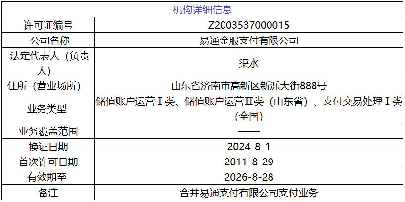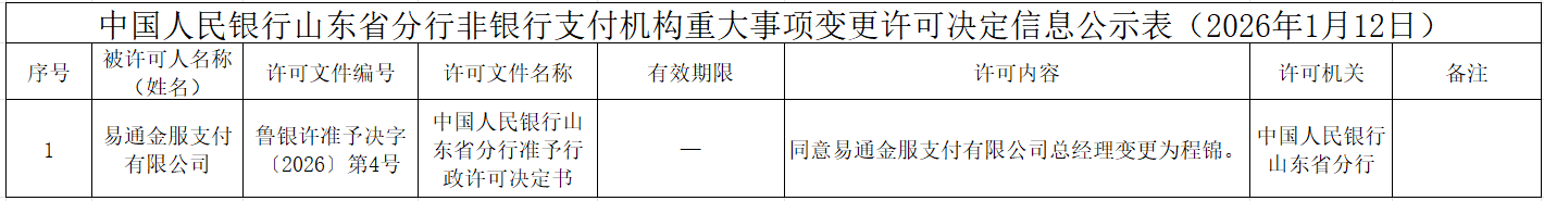 中国人民银行山东省分行非银行支付机构重大事项变更许可决定信息公示表(2026年1月12日)显示,同意易通金服支付有限公司(下称“易通金服”)总经理变更为程锦。