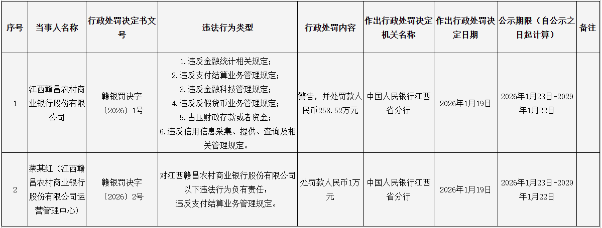 1月23日消息,中国人民银行江西省分行发布新罚单,江西赣昌农村商业银行股份有限公司因以下六项违法行为被警告,并罚款人民币258.52万元。同时,该行运营管理中心蔡某红被罚款人民币1万元。