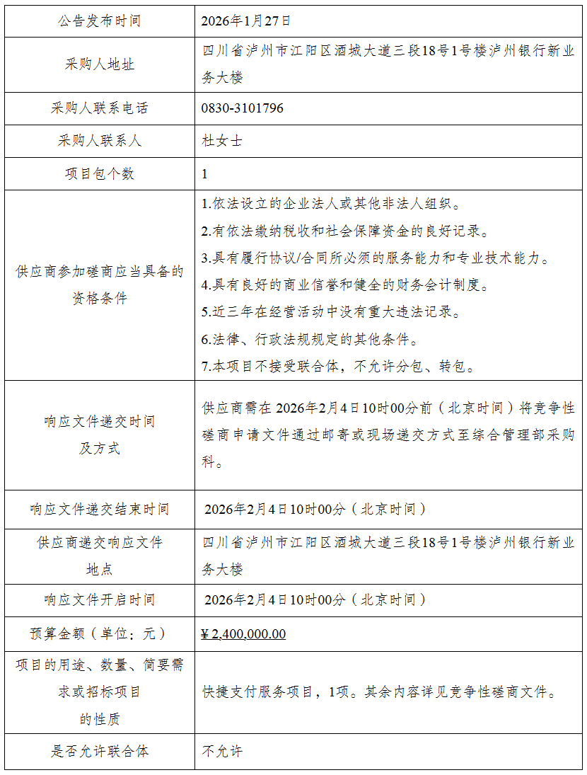 泸州银行就“快捷支付服务”项目采用竞争性磋商方式进行,兹邀请3家供应商参与,分别是:通联支付网络服务股份有限公司四川分公司、捷付睿通(内蒙古)支付股份有限公司、南京苏宁易付宝支付科技有限公司。采购信息具体如下: