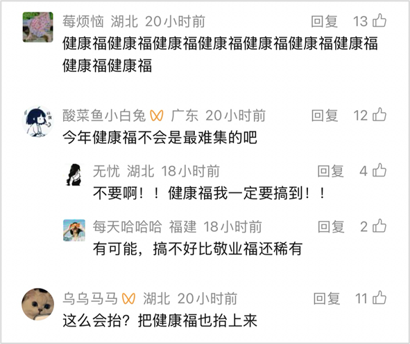 在微博、小红书等平台,相关话题迅速升温。“健康福什么时候上线”等热贴引发广泛讨论,“健康福来了吗”这一话题更是冲上微博热搜。一条“什么福都行,但最想要一张‘健康福’,送给自己和家人”的留言引发广泛共鸣,收获了高赞。