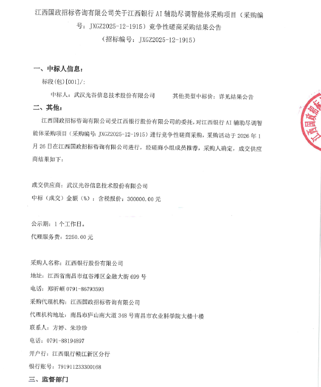 江西银行AI辅助尽调智能体采购项目采购结果公告
