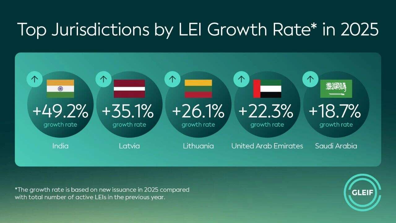 2025年,印度再次实现全球最高的LEI增长率(49.2%),并继续保持全球第二大活跃LEI总量司法辖区的地位。这一增长主要得益于印度监管机构对LEI的长期支持,使其成为提升印度金融体系和整体经济透明度的重要工具。